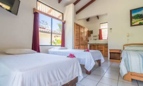 We checked in & found that there were 3 beds (wonderful for 3 friends traveling together). The owner & staff took good care of us. The food was good, breakfast variety was good & coffee available. The pool was wonderful, they kept it clean even in the wind. The grounds were a delight in brilliant flowering colors. We relaxed sitting on the porch soaking up the sun. During the mornings there was yoga, in the evenings there was karoke. There was a small kitchen setup to make your own meals.